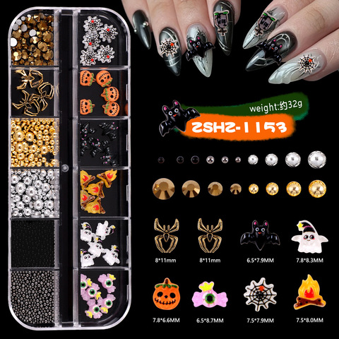 12 rejillas 3D Festival de Halloween 3D accesorios parte posterior plana DIY manicura calabaza fantasma dorado plata araña serie oscura uñas plástico